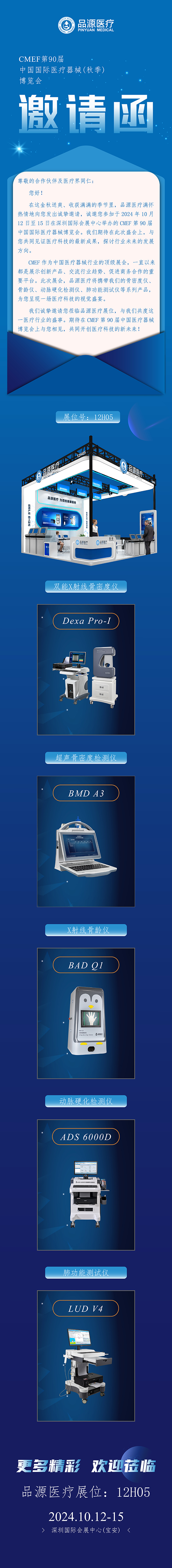 CMEF 作為中國醫(yī)療器械行業(yè)的頂級展會,一直以來都是展示創(chuàng)新產品、交流行業(yè)趨勢、促進商務合作的重要平臺。此次展會,品源醫(yī)療將攜帶我們的骨密度儀、骨齡儀、動脈硬化檢測儀、肺功能測試儀等系列產品,為您呈現(xiàn)一場醫(yī)療科技的視覺盛宴。我們誠摯邀請您蒞臨品源醫(yī)療展位12H05,與我們共度這一醫(yī)療行業(yè)的盛事。期待在 CMEF 第 90 屆中國醫(yī)療器械博覽會上與您相見,共同開創(chuàng)醫(yī)療科技的新未來!