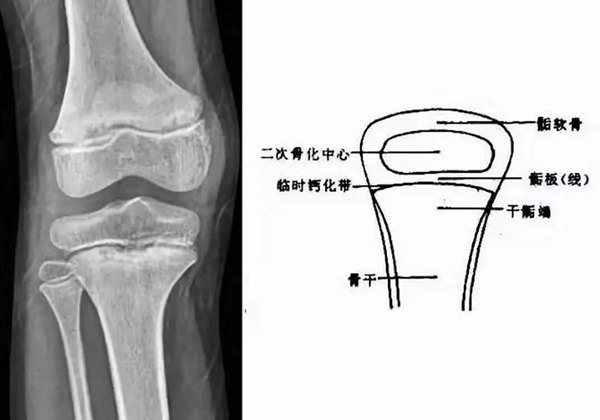 我們都知道,人體的高矮是由骨骼的生長發(fā)育決定的,特別是下肢長骨。長骨呈長管狀,在長骨的兩端有一種專管骨骼生長的骺軟骨,它與干骺端之間有一盤狀軟骨結(jié)構(gòu)稱為骺板(線),在幼兒的X光片上表現(xiàn)為一條較寬的透光帶。 (見下圖)
