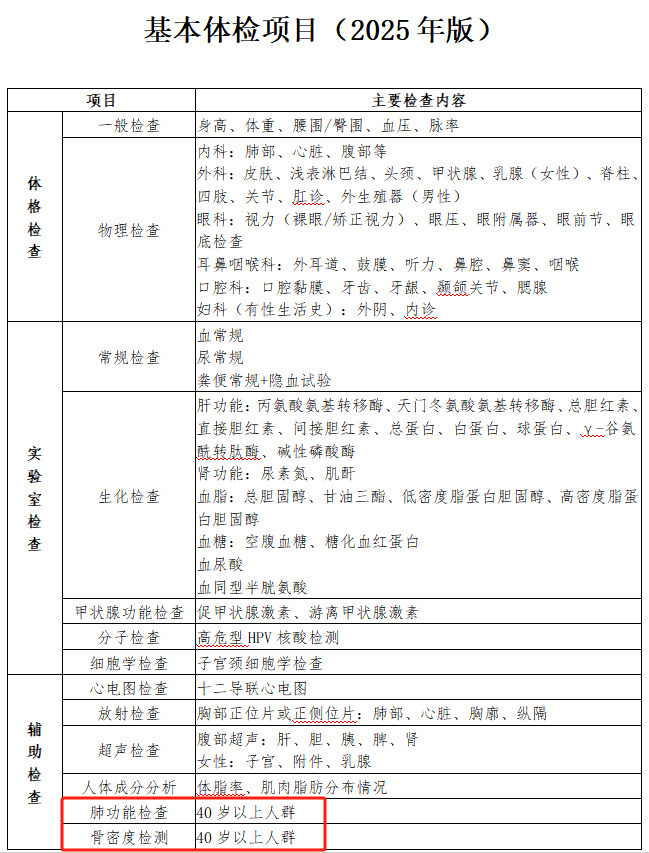 作為18歲以上成人健康體檢的重要參考標(biāo)準(zhǔn),《指引》的基本體檢項目涵蓋體格檢查、實驗室檢查、輔助檢查三大類,而此次新增的兩項檢查,正是針對40歲后高發(fā)的呼吸系統(tǒng)疾病和骨骼健康問題的精準(zhǔn)補(bǔ)充。無論是職場中堅還是退休人群,都需要及時關(guān)注這一變化,讓體檢真正成為健康的“預(yù)警雷達(dá)”。